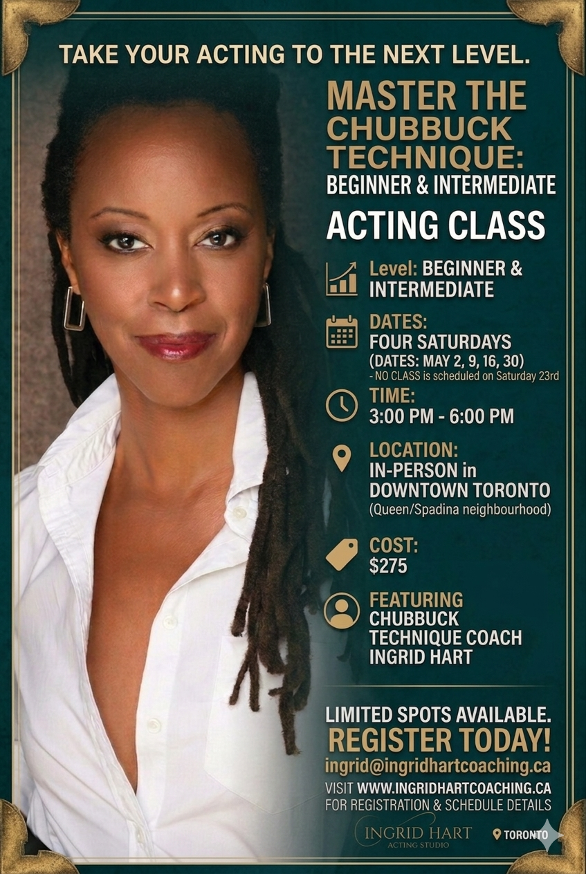 Join Ingrid Hart this May 2026 for an intensive dive into the Chubbuck Technique. Strengthen your Script Analysis and Scene Study skills and practice your acting with like-minded actors! Designed specifically for beginner and intermediate actors, this 4-week workshop will help you break through plateaus and bring a new level of emotional depth to your auditions and performances.